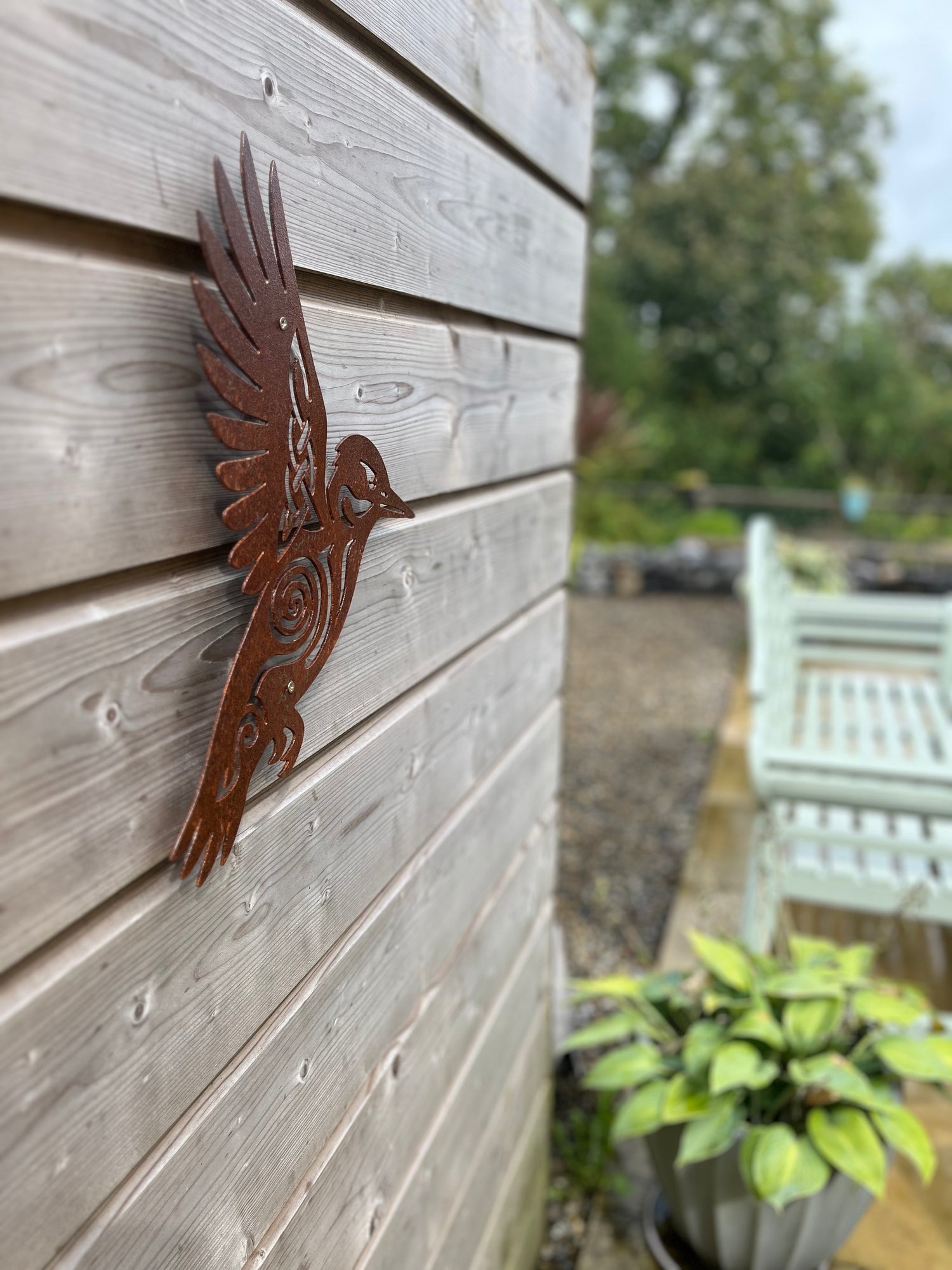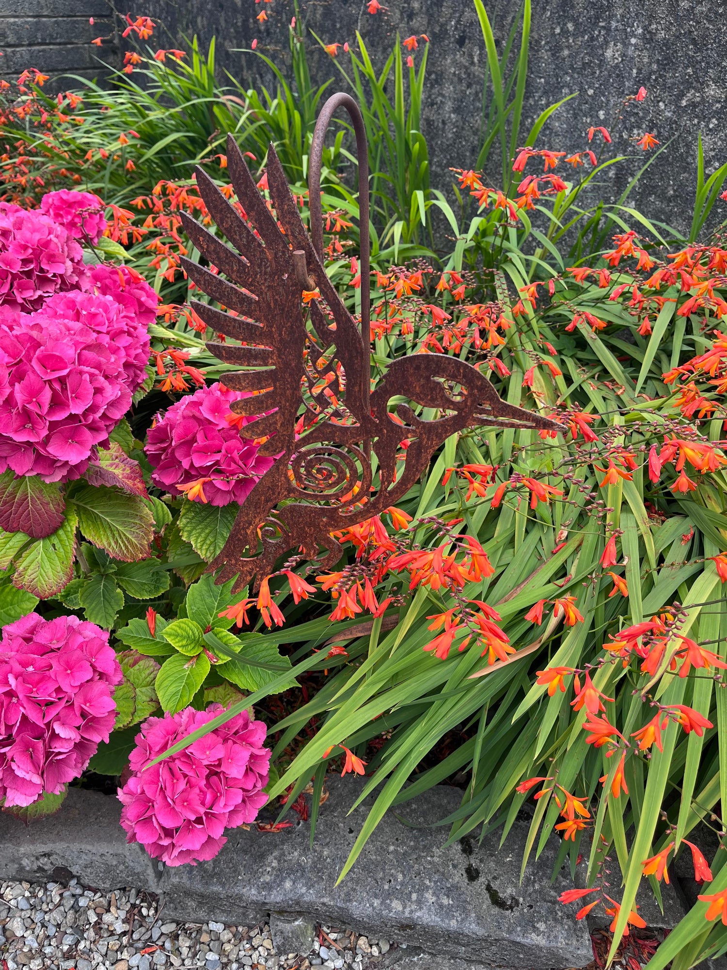 - Shepherd’s Crook Bar – Slot the sculpture over a steel bar (sold separately). The bar stakes into your garden or a planter; the sculpture rests neatly on the hook, giving the illusion of flying or leaping above your space.